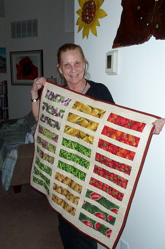I was most excited about giving Janice a quilt her mother had started before she passed away. I pieced the back to look like a garden, which reminded me of her, and my cousin Meredith finished piecing the front that she had started. Meredith also did the binding and quilting, since I was WAY short on time. I just loved how it turned out!